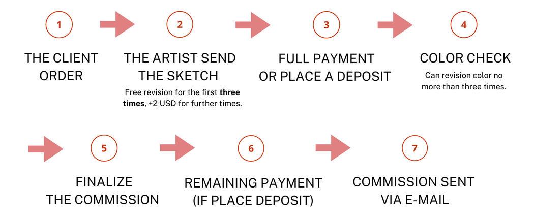 - The prices displayed on the website are simply starting price; they may increase depending on the details.- For commercial use, add +70% to the original price.- After commission comfirmed, You must place a deposit 50% of total price within 3 days.- If you have to wait queue for a long time, you can pay when your turn comes. I will notify you when it is your turn before start of work.- A rough draft of the commission will be sent to you. Any and all major revisions must be done at this stage (Ex. Face expression, some detail, hand position, etc.). Free revision for the first three times, and +2 USD for the fourth and further times.- Depending on the desired style and queue, the estimated turnaround is about one (1) week to three (3) week at the latest. If there is an unexpected situation, you will be notified.- I have the right to refuse any commission that is beyond my ability or unable to deliver on time.- All commissions will be .PNG with dimensions 3508 x 2480 px at 300DPI, unless specified otherwise. Exceptions may be made, depending on the commission.- I have a right to upload the commission on any/ all social media (Twitter (X), Facebook, etc.) unless specified beforehand to keep the commission private.